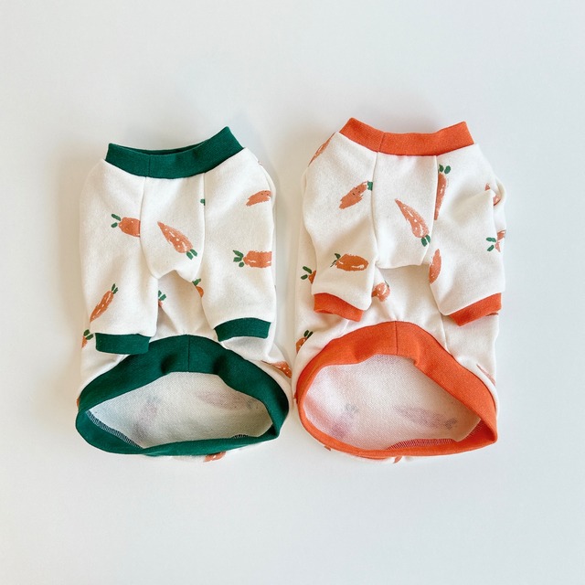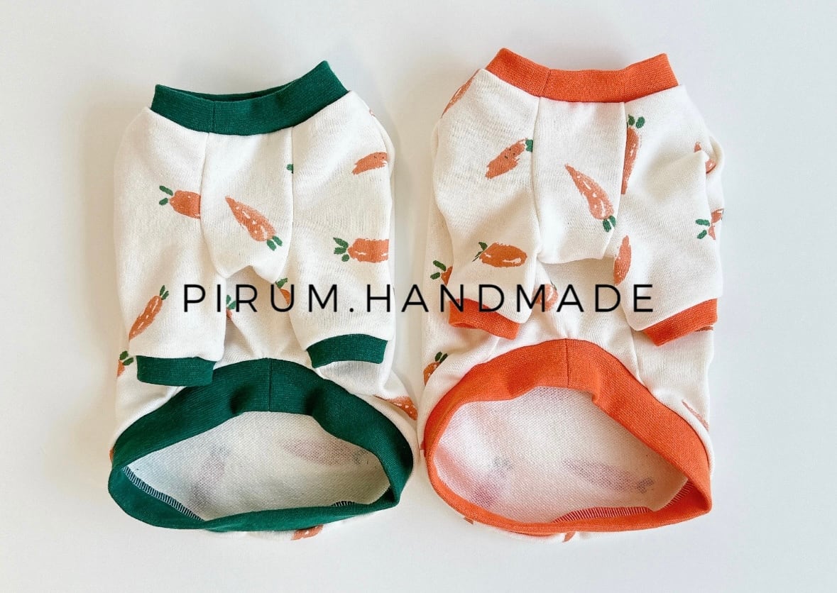 ---------------------------------------- 裏パイル生地のにんじんTシャツ☆ ラグランスリーブなのでお洋服の脱ぎ着が苦手なわんちゃんにも着せやすく、動きやすさも抜群です! オレンジとグリーン、好きなリブのカラーを選べます♪ ---------------------------------------- ※こちらの商品は受注販売となります。ご注文をいただいてから制作いたしますので、発送まで約2〜7日ほどお時間をいただきます。できるだけ迅速に対応させていただきますのでご了承くださいませ。※ ■生地■ 身頃 コットン100% リブ コットン95% ポリウレタン5% ※生成り特有の綿カスやネップが入ります。 ■サイズ■ ※お洋服の実寸サイズを記載しています。 《PIRM.基本サイズ》 お洋服の生地によって多少変わることがございます。 S 首周り(リブの付け根部分) 24 胴回り 36 着丈 (首リブの付け根から裾の端まで) 26 M 首周り(リブの付け根部分) 26 胴回り 40 着丈 (首リブの付け根から裾の端まで) 29 L 首周り(リブの付け根部分) 29 胴回り 44 着丈 (首リブの付け根から裾の端まで) 30 XL 首周り(リブの付け根部分) 31 胴回り 48 着丈 (首リブの付け根から裾の端まで) 33 ♡わんこのヌードサイズよりも首周り+2〜3cm、胴回り+3〜4cm、着丈(首から尻尾の付け根)−2〜5cmを目安にお選びください♪ ♡写真モデルのぽぽちゃん(3.8kg)の着用サイズはMサイズです。 ヌードサイズ▶︎ 首周り約23、胴回り約34、着丈38 ---------------------------------------- ※布端はロックミシンで処理しています。 ※お洗濯は手洗い推奨です。形を整えてから干してください。 ※お洗濯にて多少の縮みが出ることがございます。 ---------------------------------------- 〖 ご購入時の注意点 ᝰ✍︎꙳⋆ 〗 ♥ハンドメイドアイテムということを十分にご理解いただきますようお願いします。 ♥強度を上げるために重ね縫いをしている場合がございます。 ♥アイテムはひとつひとつ丁寧に制作しておりますが、色や形に若干の違いが生じる場合がございます。また、デリケートな作品のため強い力を加えると、破損する可能性がございます。お取り扱いには十分にお気をつけください。 ♥お使いの端末や閲覧環境により、写真と実物の色味や質感、サイズ感が多少異なって見えることがございます。 ♥明らかな不良品以外のお客様都合による返品・返金はお断りしております。