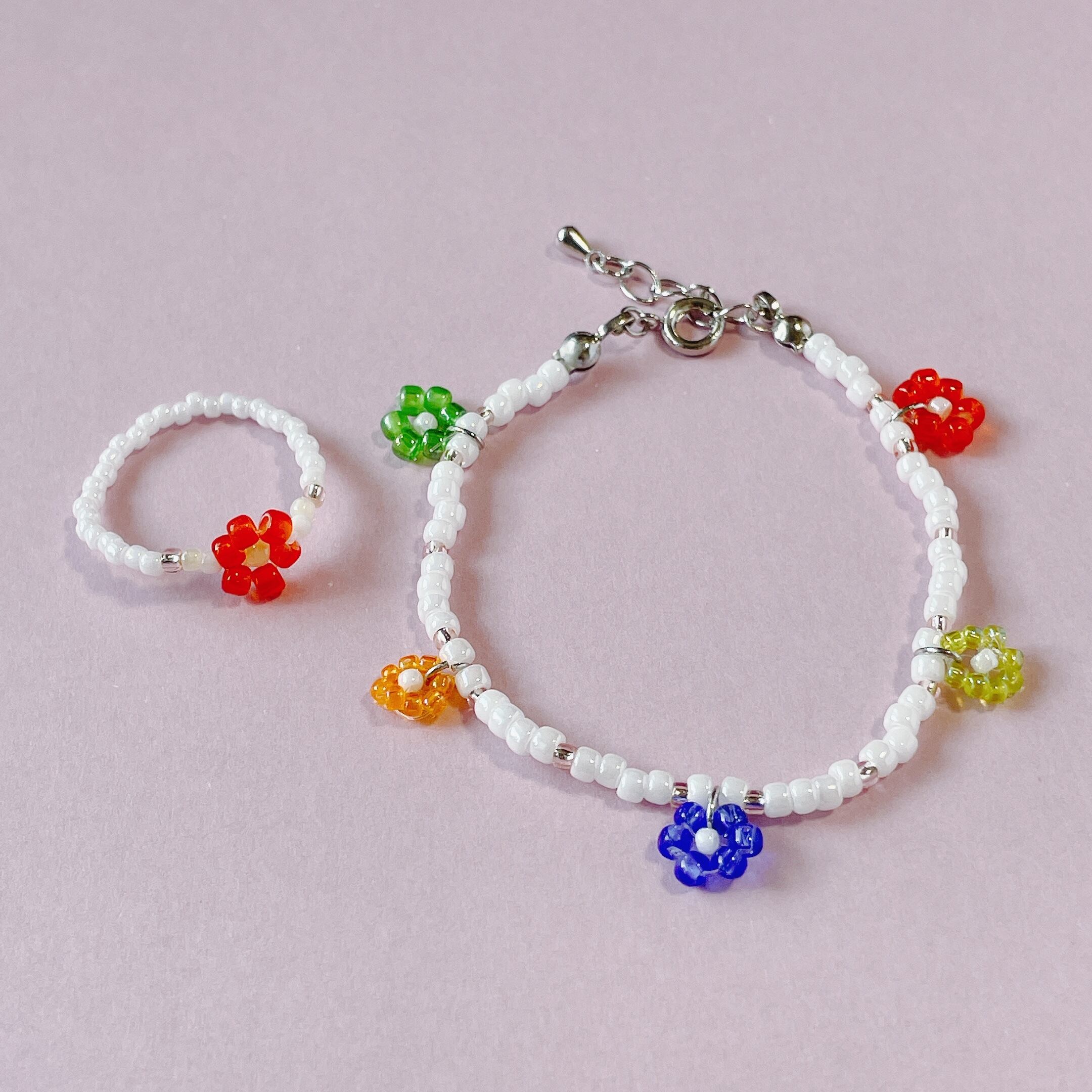 カラフルで小さいお花がちりばめられたブレスレットとリングのセットです♡