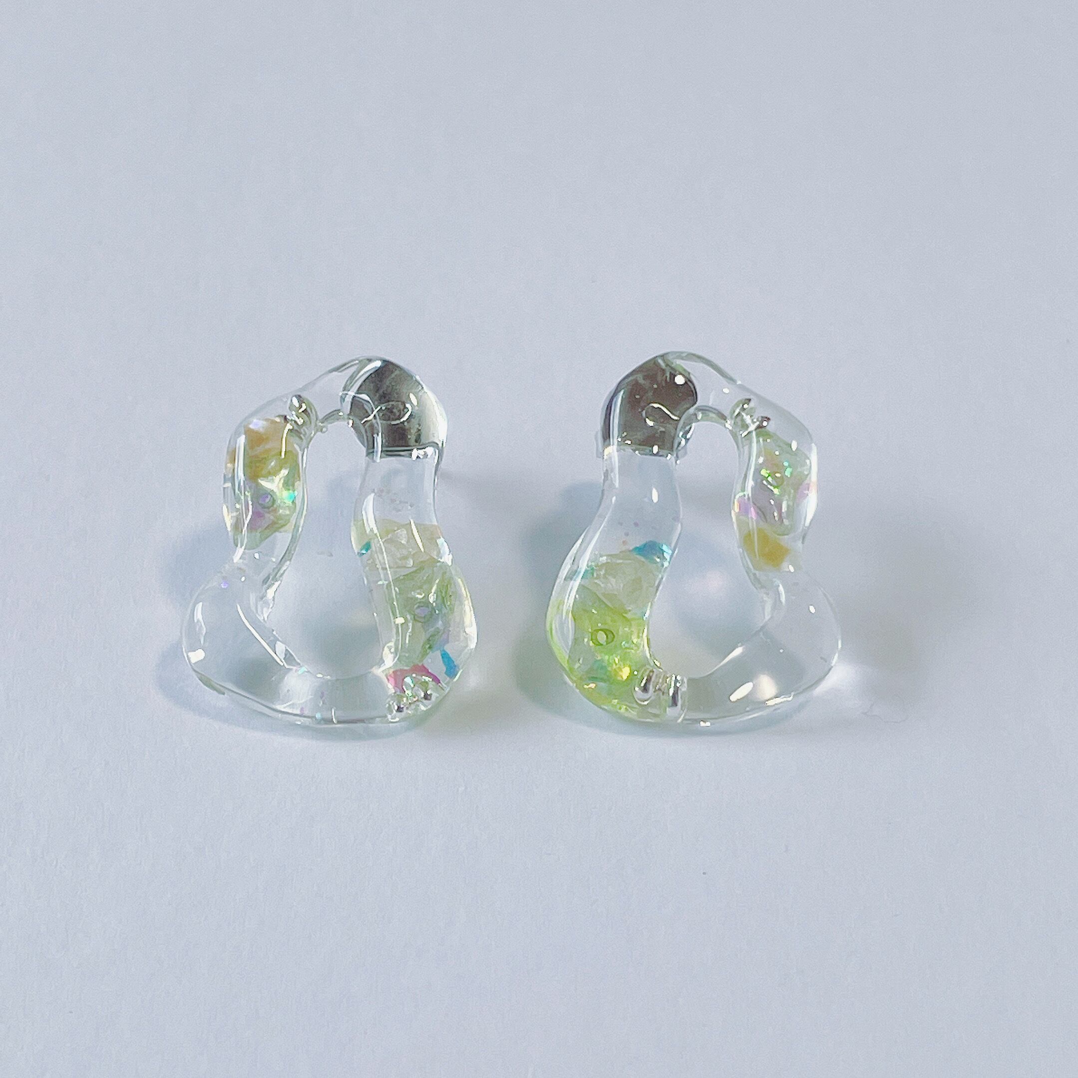 クリアなうねうねの中にキラキラと透明感のあるパーツを閉じ込めたピアスです♪